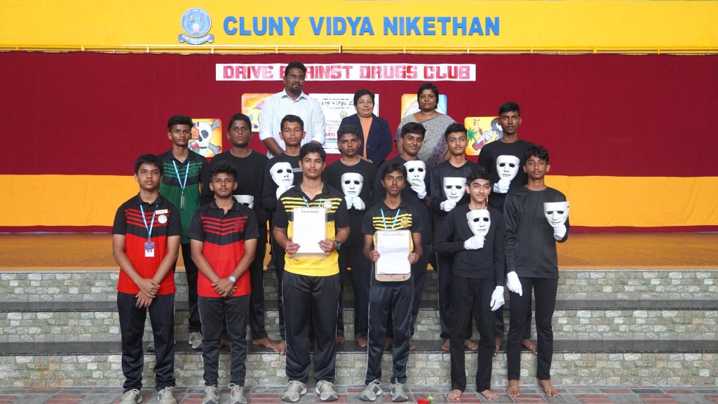 Cluny Vidya Nikethan (Senior Secondary School), Erumapalayam, Salem, organized the 5th monthly follow-up campaign of the Drive Against Drugs Club on 25th October 2025 in the school assembly hall. The event aimed to create awareness among students about the importance of living a drug-free life. The Chief Guest, Dr. S. Kala, Assistant Professor, Department of Commerce, Vivekanandha Arts and Science College for Women, Sankagiri, graced the occasion and addressed the students with an inspiring message on making wise choices and staying away from harmful habits. Her words motivated the young minds to lead disciplined, healthy, and purposeful lives. The campaign concluded with a strong pledge by the students to spread the message of a drug-free society and be ambassadors of positive change.